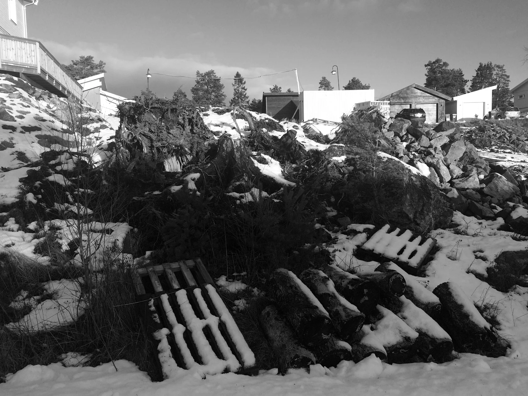 Ett svårt uppdrag. Tomten sluttar brant mellan två villagator och fyra olika avgränsande fastigheter. En bergstomt som denna kräver att man spränger för att få plan mark att stå på. Vi sparade sprängsten till murarna.