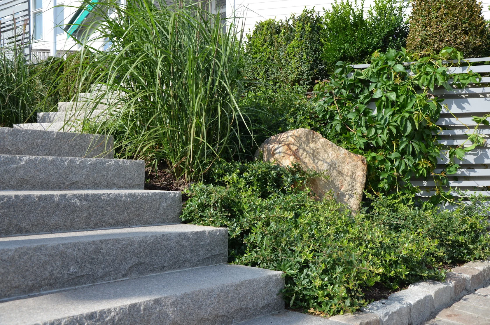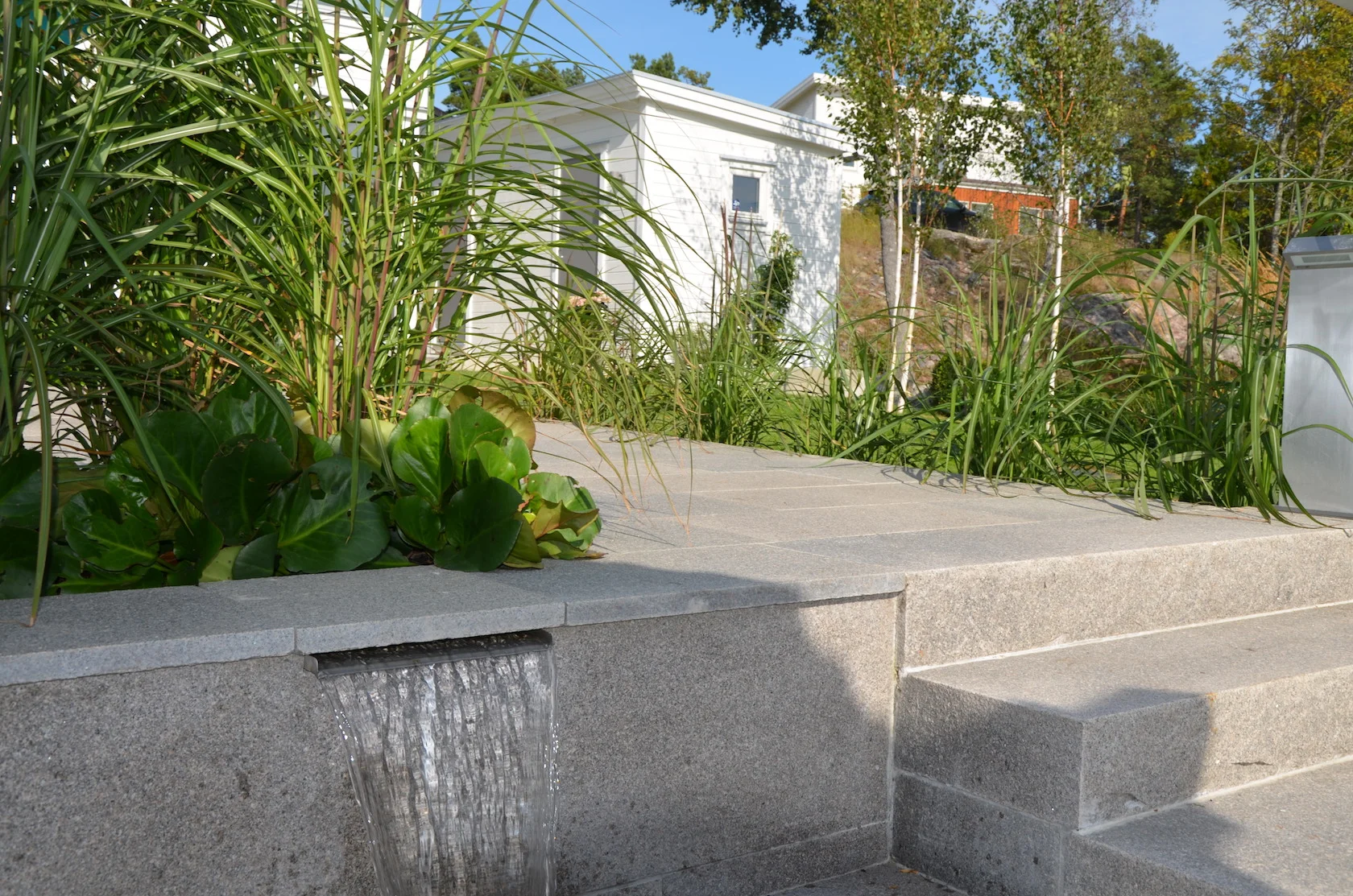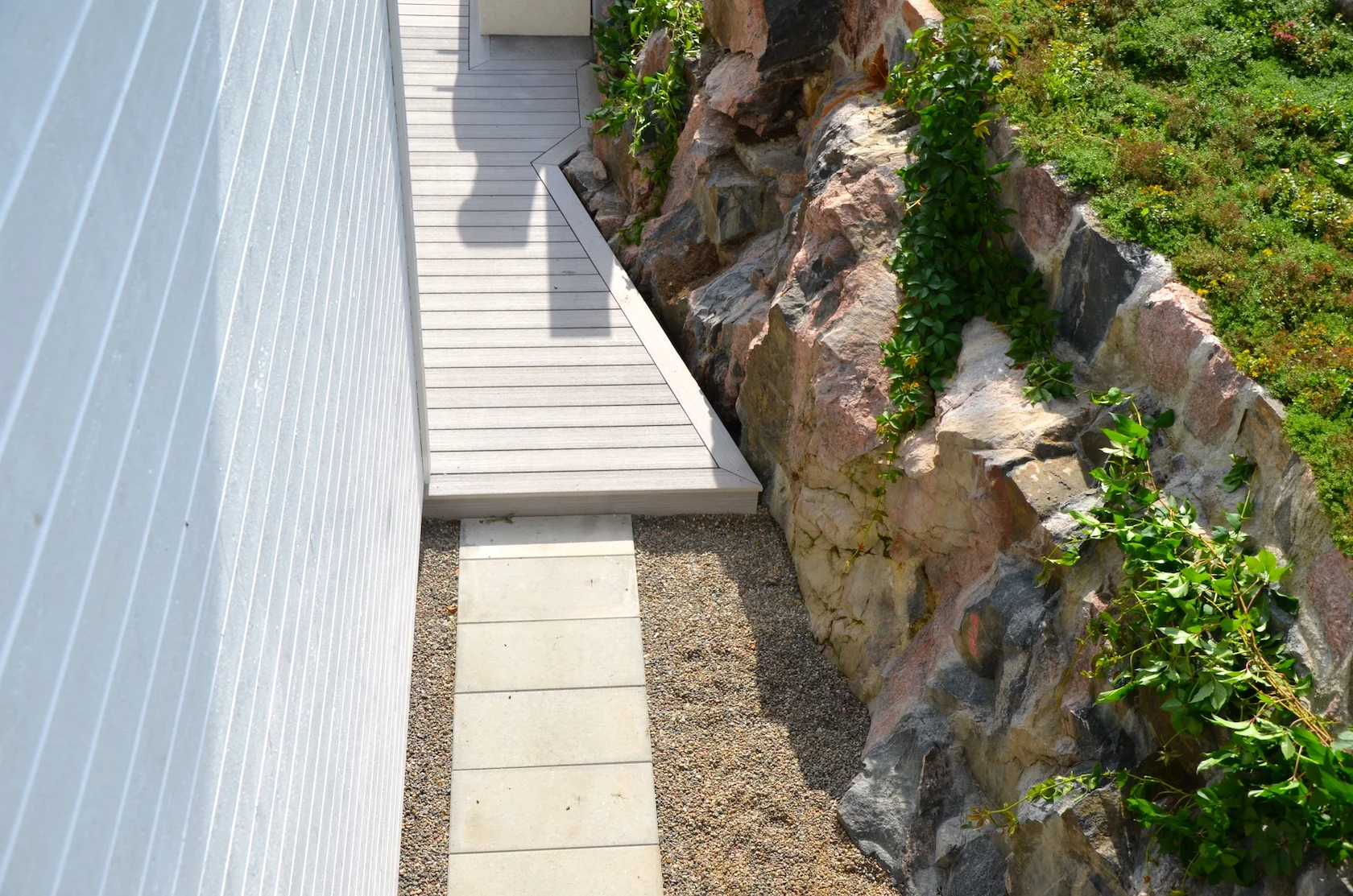 Svårigheten att hitta kommunikationsvägar på en sluttningstomt med så många olika funktioner löstes successivt genom bra dialog med husägarna. Stenmurar, trappor, avsatser, sittplatser och gångar passades in på ritningen som kändes pytteliten... Mellanrummen planterades med insynsskyddande växtlighet passande för soligt, blåsigt och torrt läge.