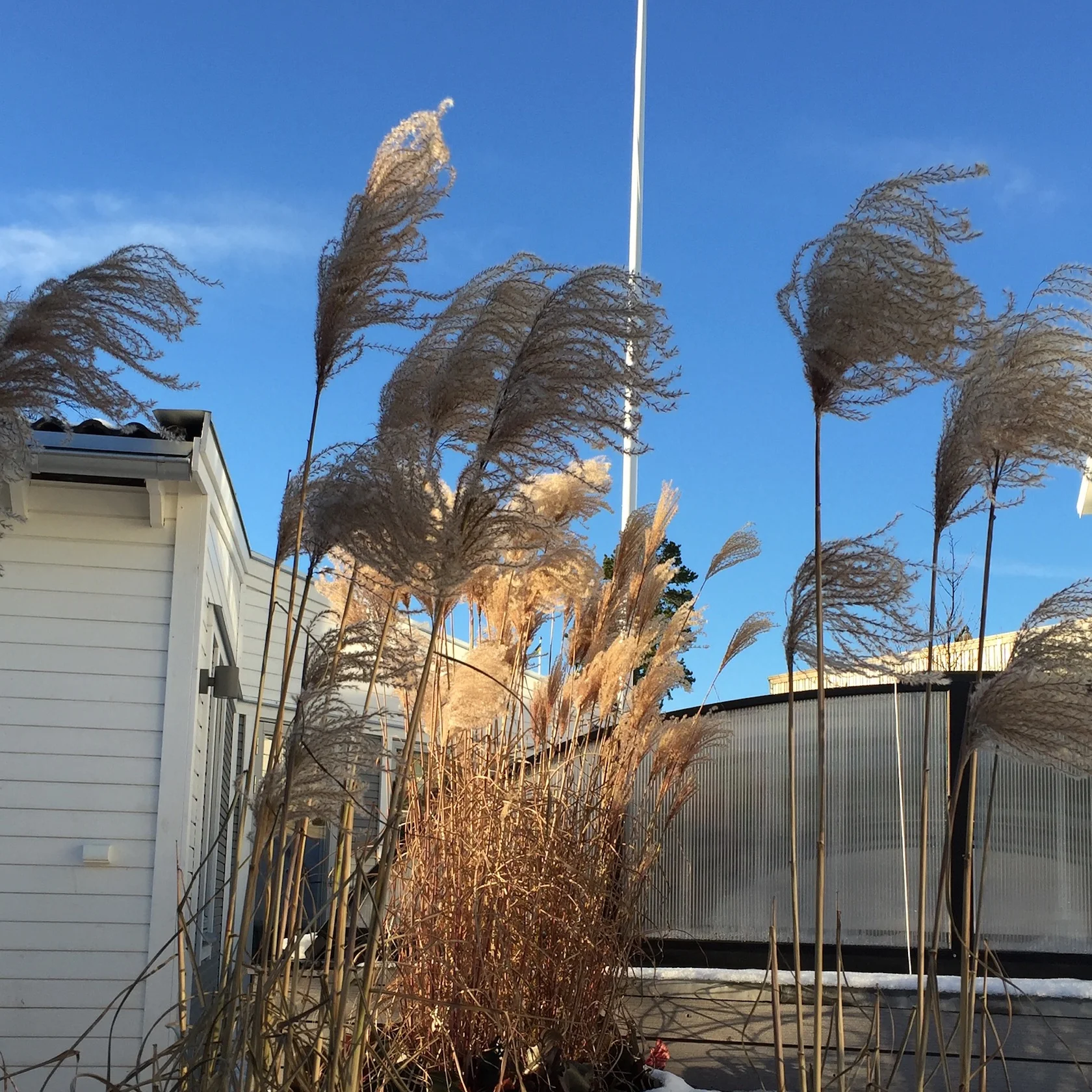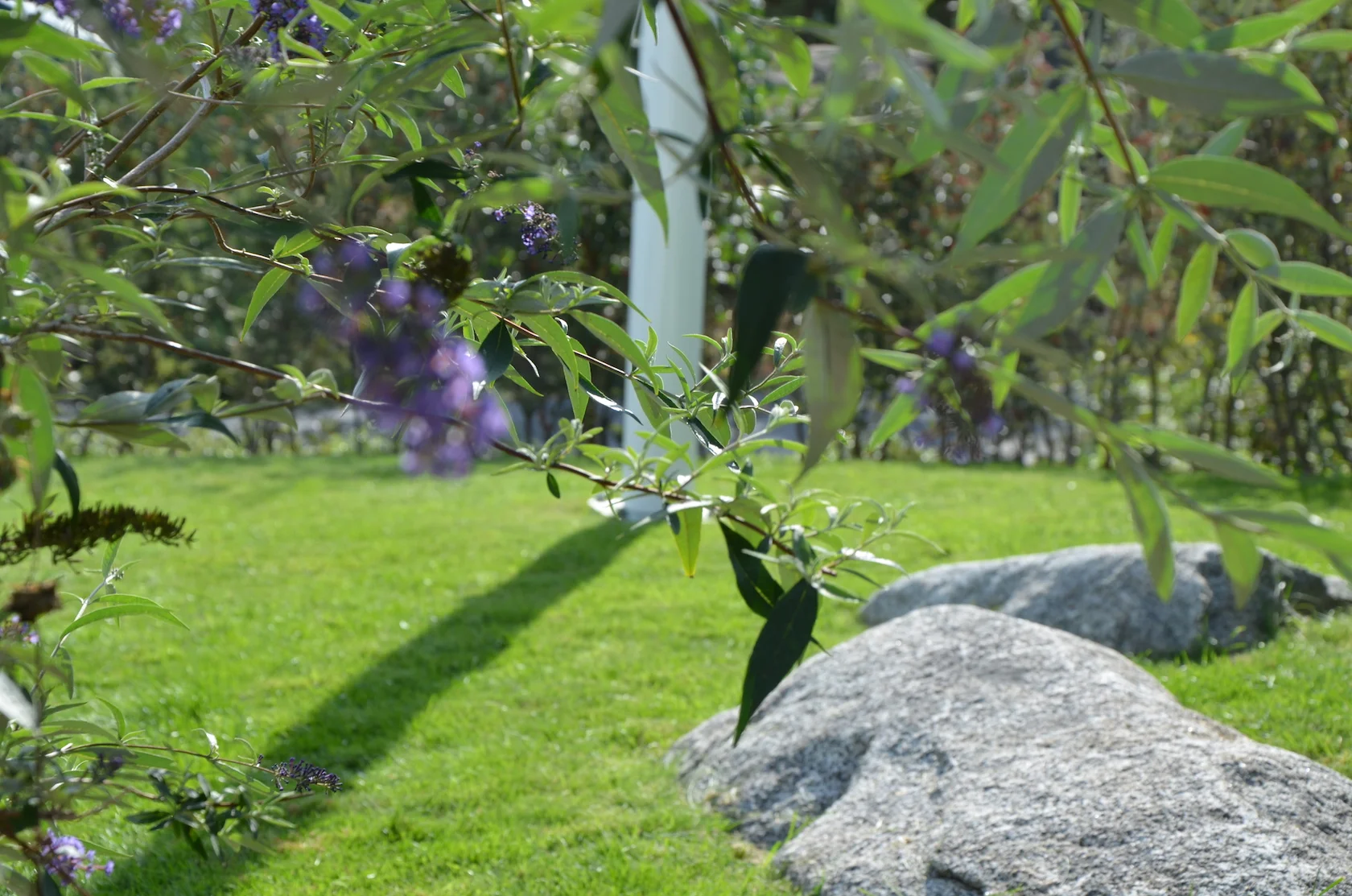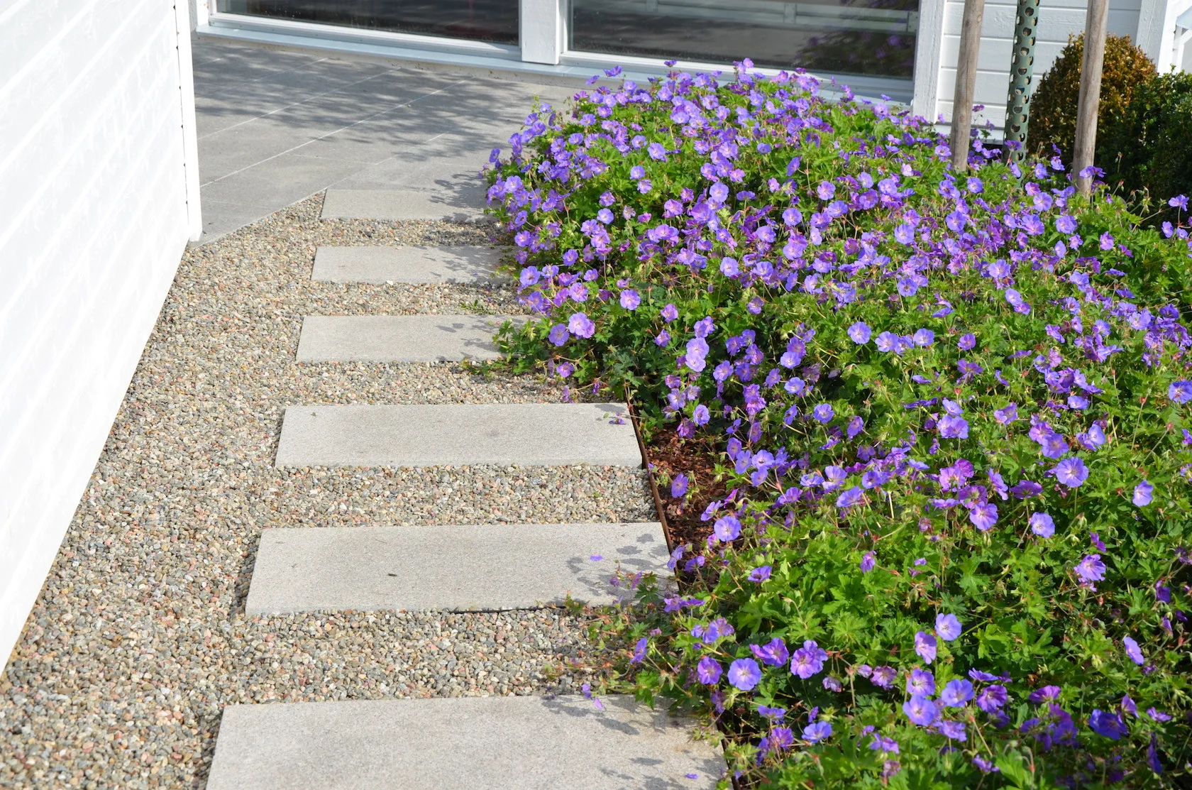 Svårigheten att hitta kommunikationsvägar på en sluttningstomt med så många olika funktioner löstes successivt genom bra dialog med husägarna. Stenmurar, trappor, avsatser, sittplatser och gångar passades in på ritningen som kändes pytteliten... Mellanrummen planterades med insynsskyddande växtlighet passande för soligt, blåsigt och torrt läge.